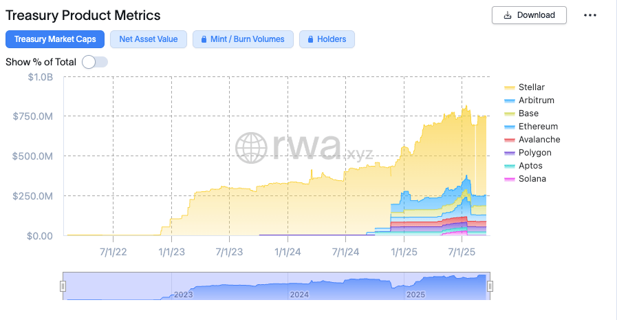 That changed in 2023. Franklin Templeton launched the first SEC-registered fund to use public blockchain infrastructure. Its OnChain U.S. Government Money Fund was initially built on Stellar and later mirrored to Ethereum. It offers exposure to short-duration U.S. Treasuries but uses tokenized shares as the delivery mechanism. Ownership is recorded on-chain. Transfers and redemptions are processed through smart contract logic. The structure is conservative, but the infrastructure is not.